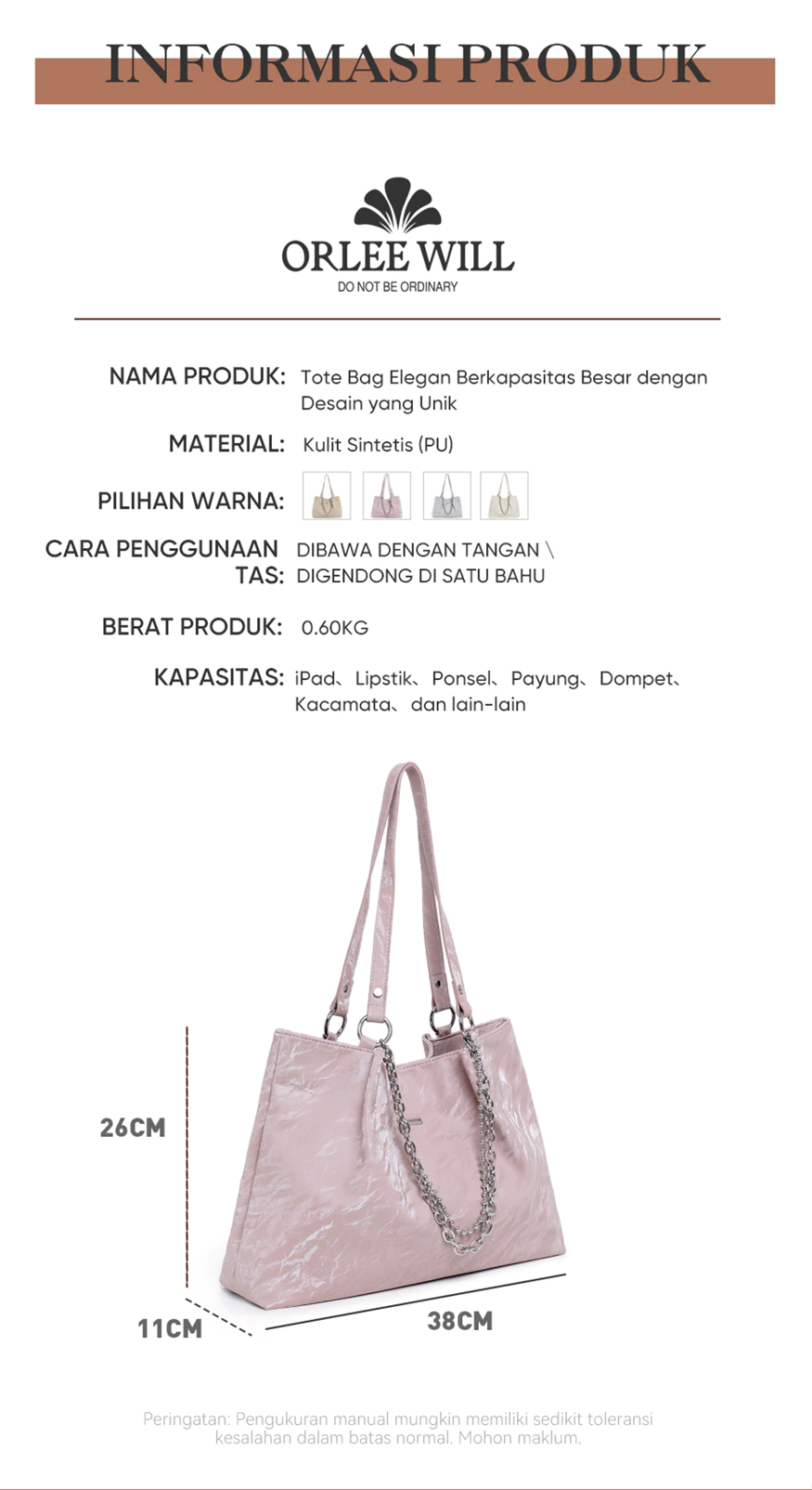 Tas Tote Wanita Tas Tangan Rantai Tas Bahu Kapasitas Besar Tas Laptop Orlee Will